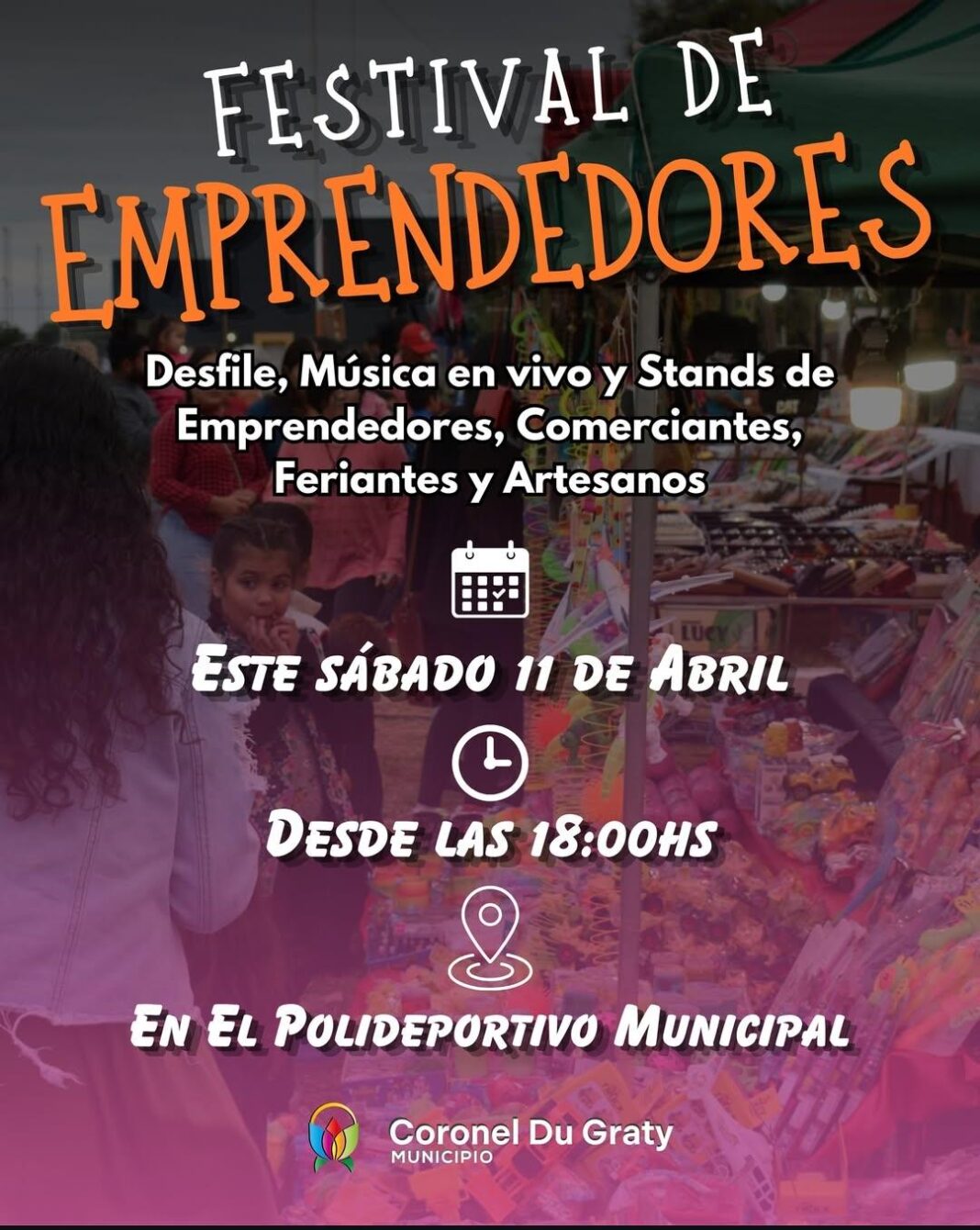 El Municipio de Coronel Du Graty ha organizado para este sábado 11 de abril el «Festival de Emprendedores», una iniciativa diseñada para promover y acompañar el trabajo de los pequeños productores, feriantes, artesanos y comerciantes locales. El evento busca fortalecer la economía local, ofreciendo un espacio de visibilidad y comercialización directa, donde los asistentes podrán recorrer diversos stands y disfrutar de una amplia oferta de productos regionales.