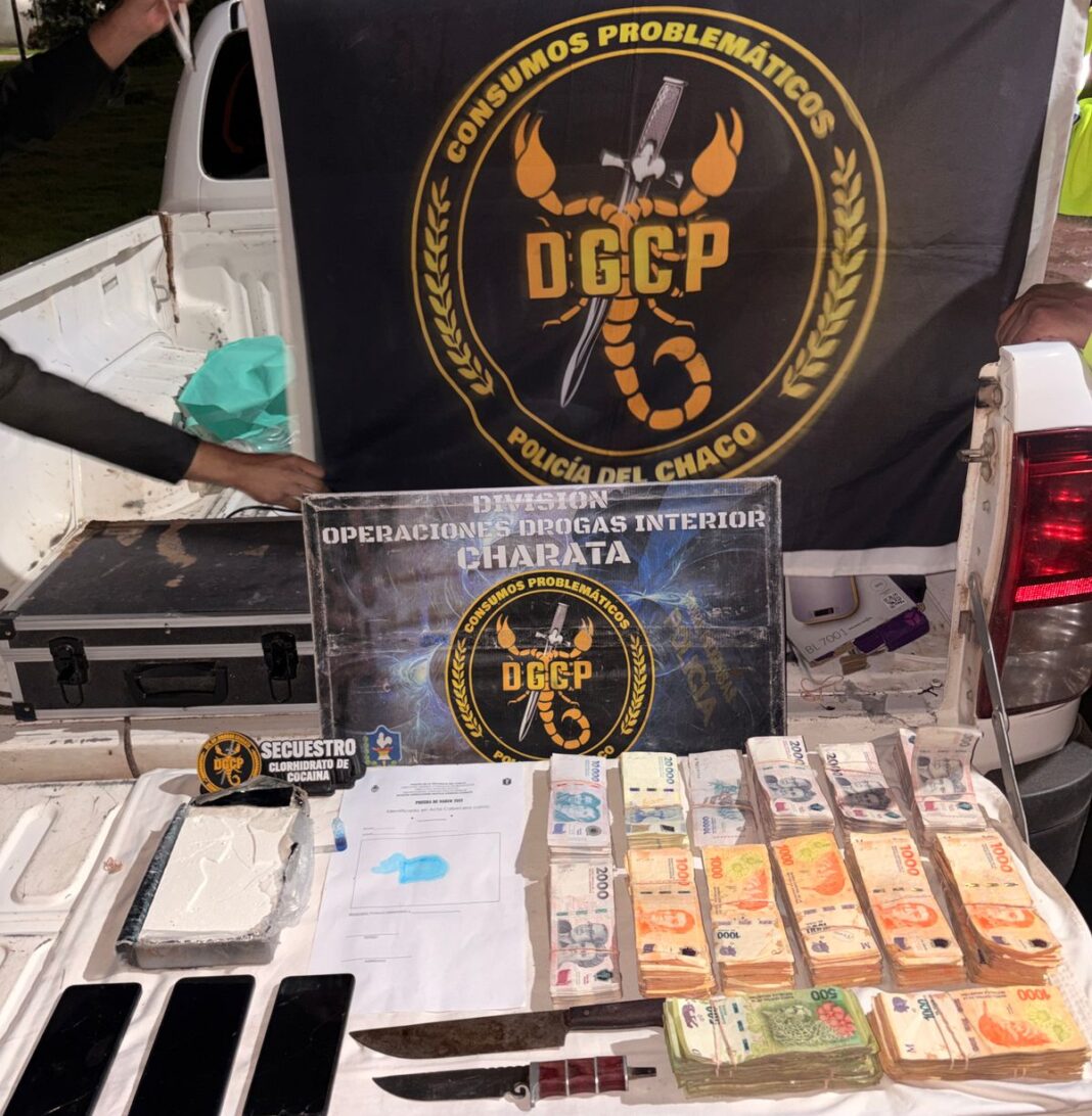 Elementos Secuestrados y Situación Judicial Además de la droga, la policía incautó la suma de $5.486.850 en efectivo, tres teléfonos celulares, dos armas blancas y el vehículo utilizado en el hecho. Los dos involucrados fueron puestos a disposición de la justicia bajo los cargos de infracción a la Ley 23.737 de Estupefacientes, quedando toda la evidencia bajo custodia de la División de Drogas Peligrosas para continuar con la investigación sobre el origen y destino del cargamento.