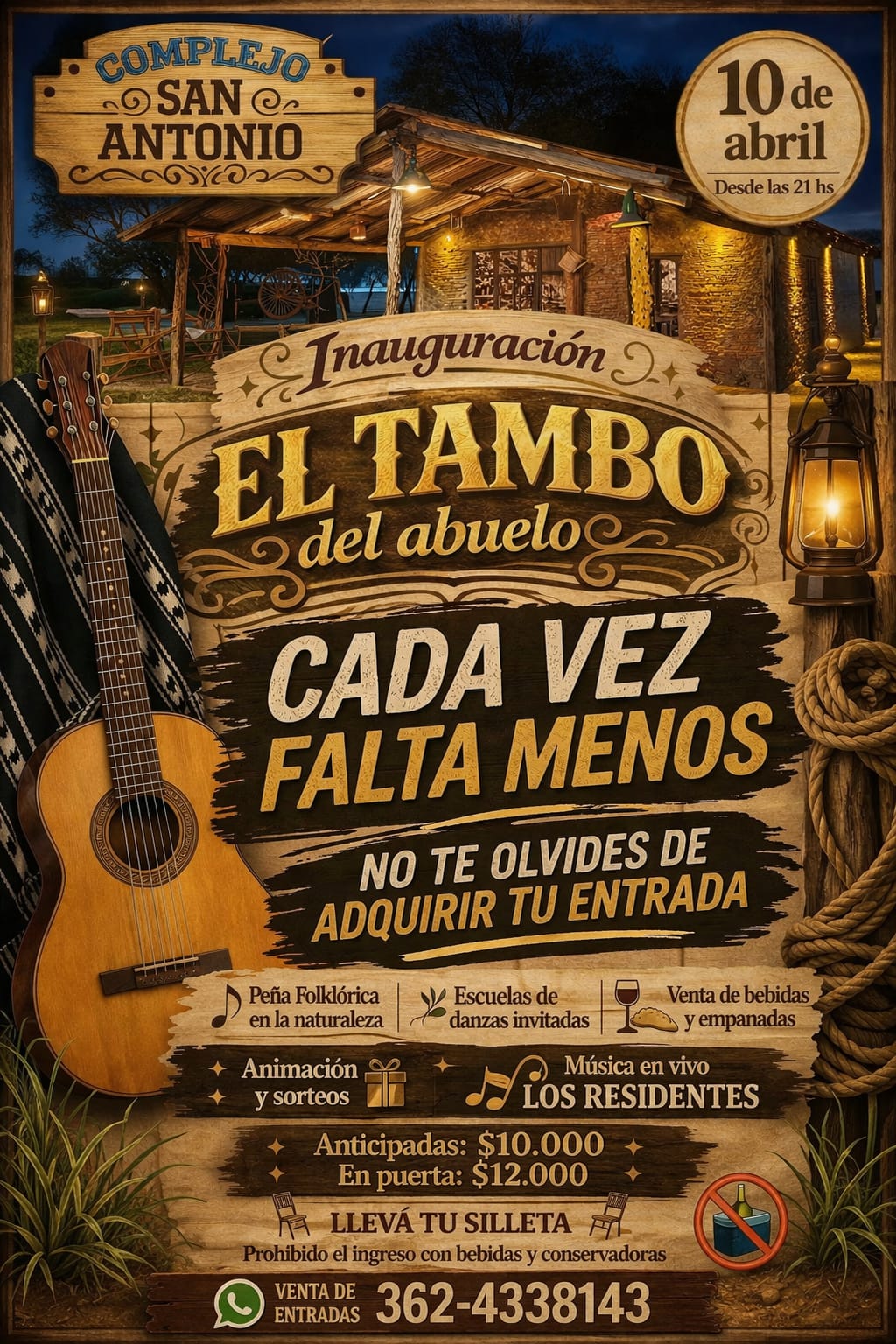 El próximo viernes 10 de abril, la capital chaqueña sumará un nuevo punto de encuentro cultural con la inauguración oficial de «El Tambo del Abuelo». El evento tendrá lugar en las instalaciones del Complejo San Antonio a partir de las 21:00 hs, ofreciendo a los asistentes la oportunidad de disfrutar de una auténtica peña folklórica en un entorno natural único. La propuesta busca fortalecer las raíces locales en un espacio diseñado para el esparcimiento familiar y el encuentro entre amantes de nuestra música.