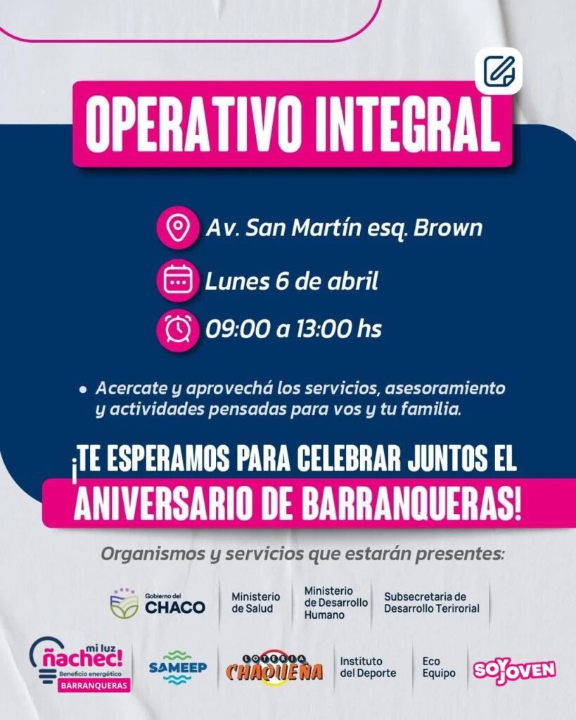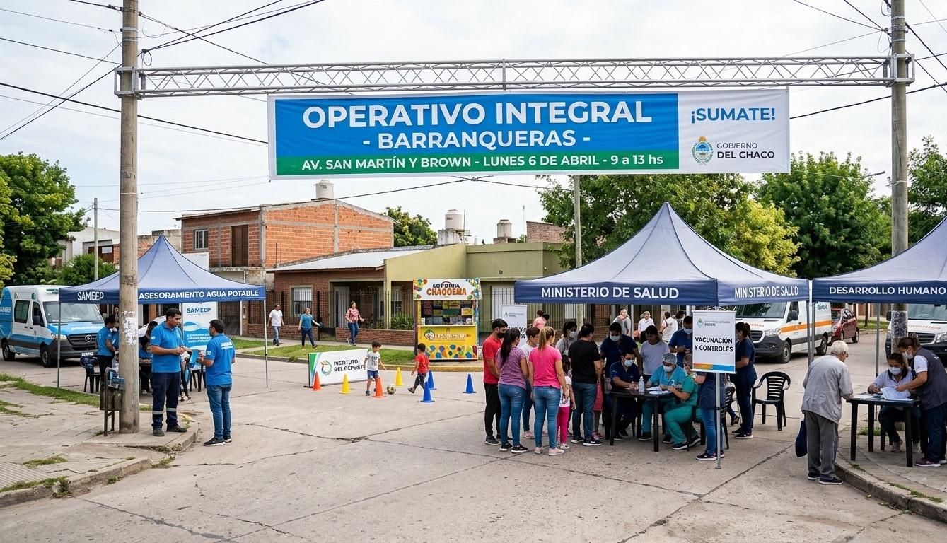 El Gobierno del Chaco llevará adelante un nuevo Operativo Integral este lunes 6 de abril en la ciudad de Barranqueras, con el objetivo de facilitar el acceso de los vecinos a trámites, servicios de salud y programas de asistencia social. La intervención territorial tendrá lugar en el cruce de la avenida San Martín y la calle Brown, funcionando en el horario matutino de 9:00 a 13:00. Esta iniciativa se inscribe en el marco de las celebraciones por el nuevo aniversario de la localidad portuaria, buscando fortalecer la presencia del Estado provincial en los barrios con respuestas directas a las demandas de la comunidad.